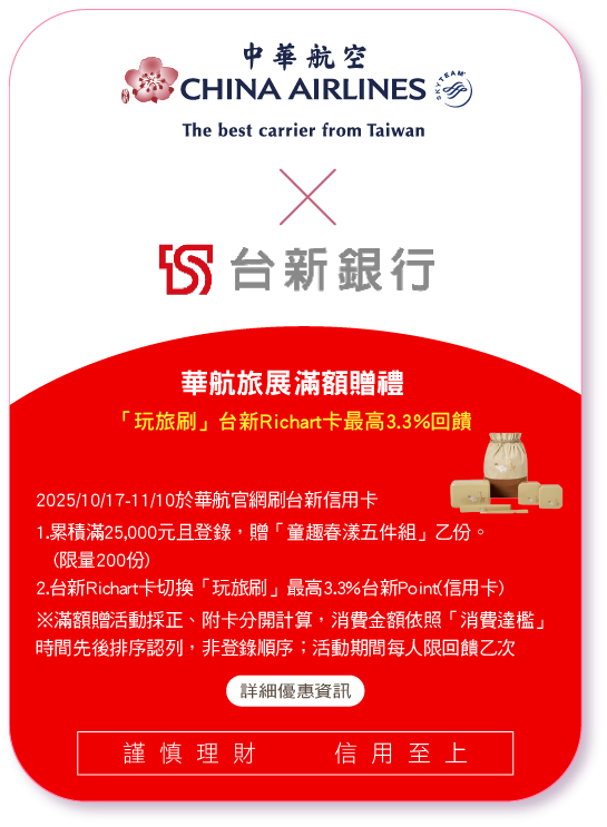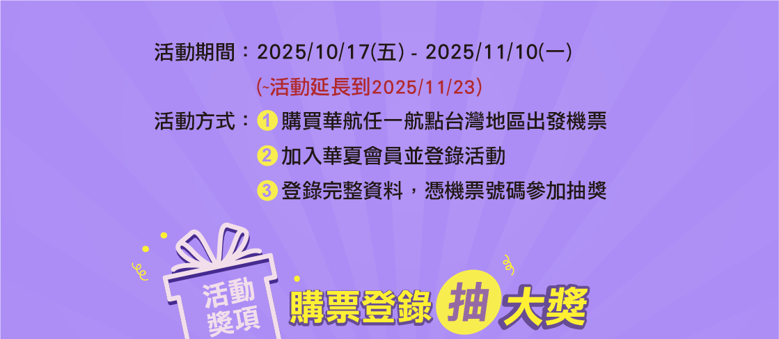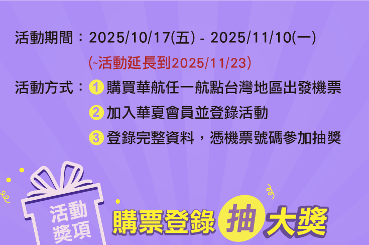 2025 年 10 月 17 日(五)起至 2025 年 11 月 10 日(一)23:59 止。(~活動延長到 11 月 23 日(日)23:59 止)